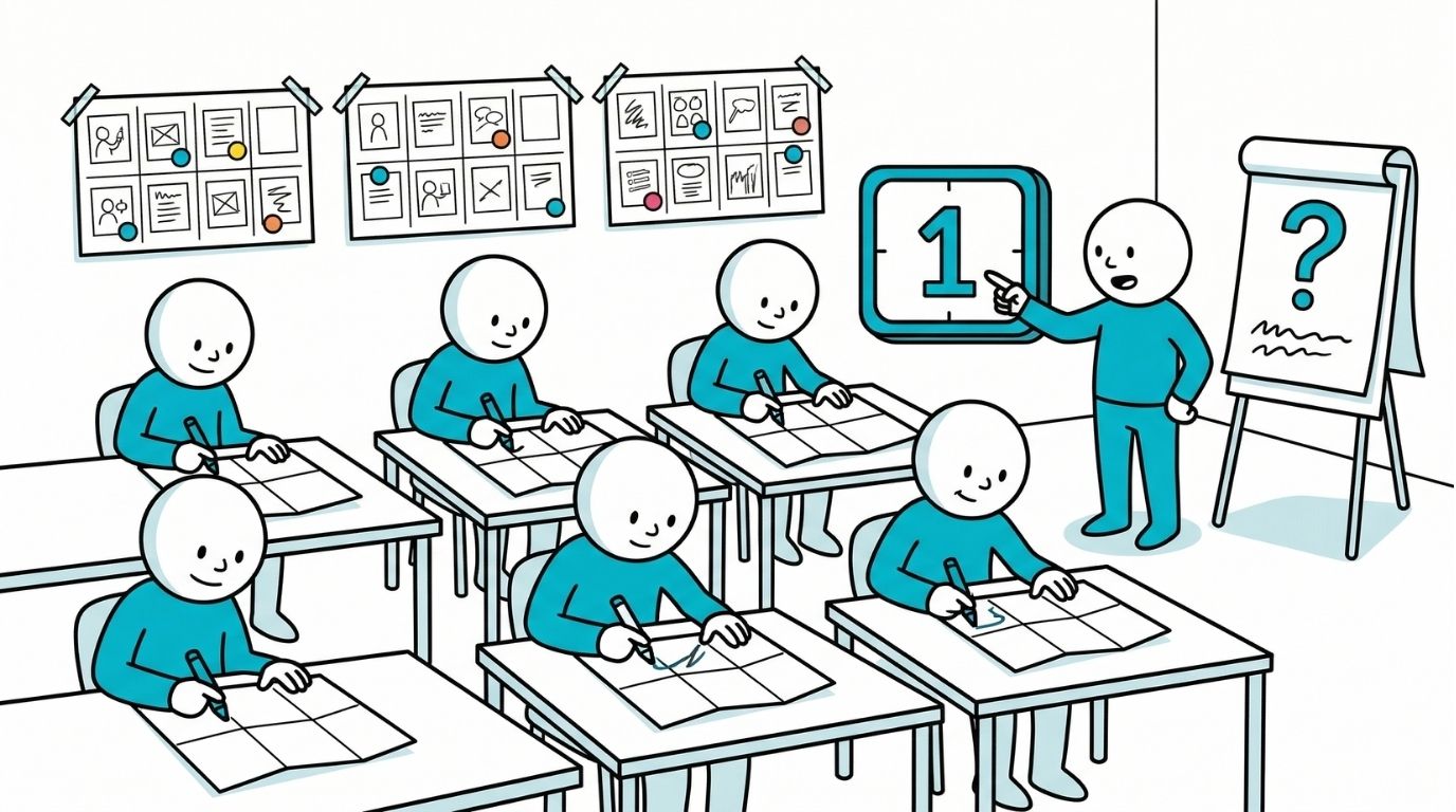 Participants sketch eight different ideas, spending one minute per panel under time constraints to promote quick thinking and creativity.