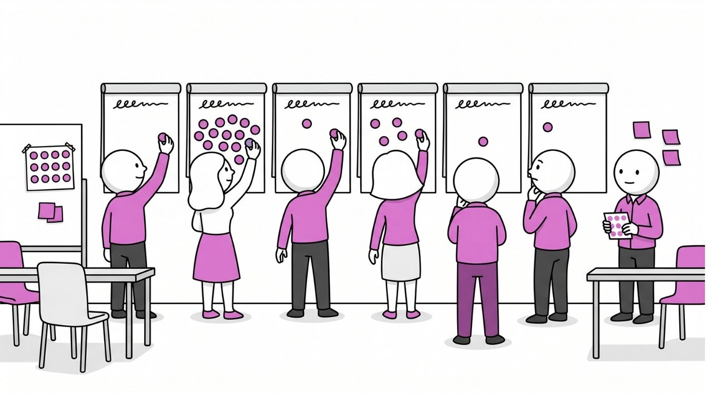 Dot Voting is a quick group prioritisation method where each person gets a fixed number of sticky dots and places them on the options they prefer. The appeal is speed and visibility: in five minutes you can turn a long list of possibilities into a prioritised shortlist that everyone has helped shape.