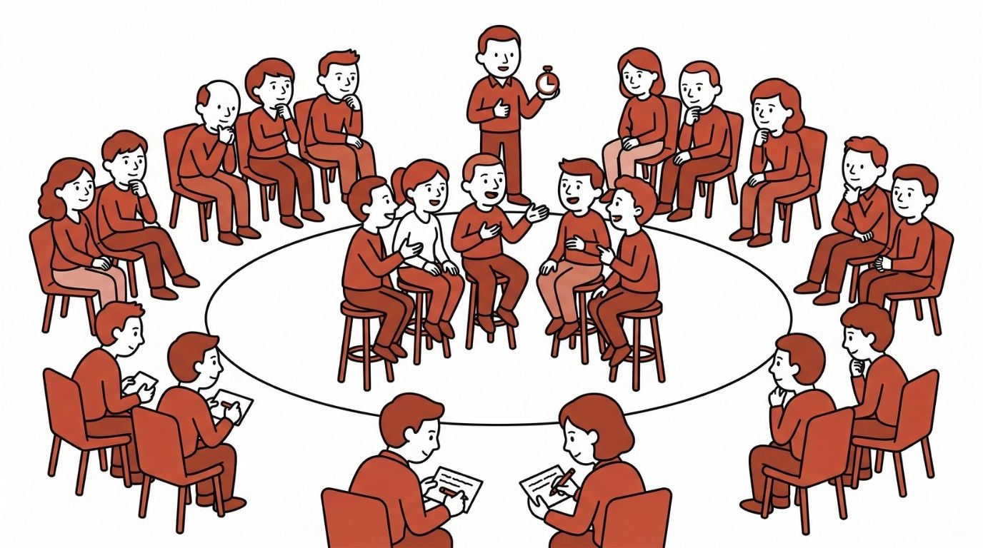 A small group of people who have direct, hands-on experience with a particular challenge sit in an inner circle and have a conversation with each other while a larger group observes from an outer circle. The people in the middle talk about what they did, what worked, what failed, and what they learned, as if the audience were not there. The outer circle listens, notices patterns, and then generates questions.